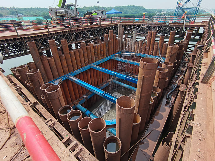 蟠龍大橋主橋涉水施工措施是技術(shù)難點(diǎn)、重要性節(jié)點(diǎn)、施工危險(xiǎn)性較大工程之一,主要技術(shù)難點(diǎn)在于水中墩柱承臺的圍堰施工,針對薄覆蓋層硬質(zhì)河床、承臺入巖等水文地質(zhì)、設(shè)計(jì)要求,工程管理公司黨總支在蟠龍大橋項(xiàng)目成立黨員先鋒隊(duì)攻堅(jiān)小組,精心組織、知難而上、勇于探索,在水中P17#、P18#墩采用了“成套鎖扣鋼管樁(φ630)+全套管全回轉(zhuǎn)鉆引孔開槽+清槽嵌固+封底”的圍堰方案,成功破解了項(xiàng)目建設(shè)中,水中薄覆蓋層硬質(zhì)河床引孔開槽、鋼管樁搭設(shè)鎖扣、反循環(huán)清槽、細(xì)石混凝土封槽、鎖扣止水等技術(shù)難點(diǎn)。