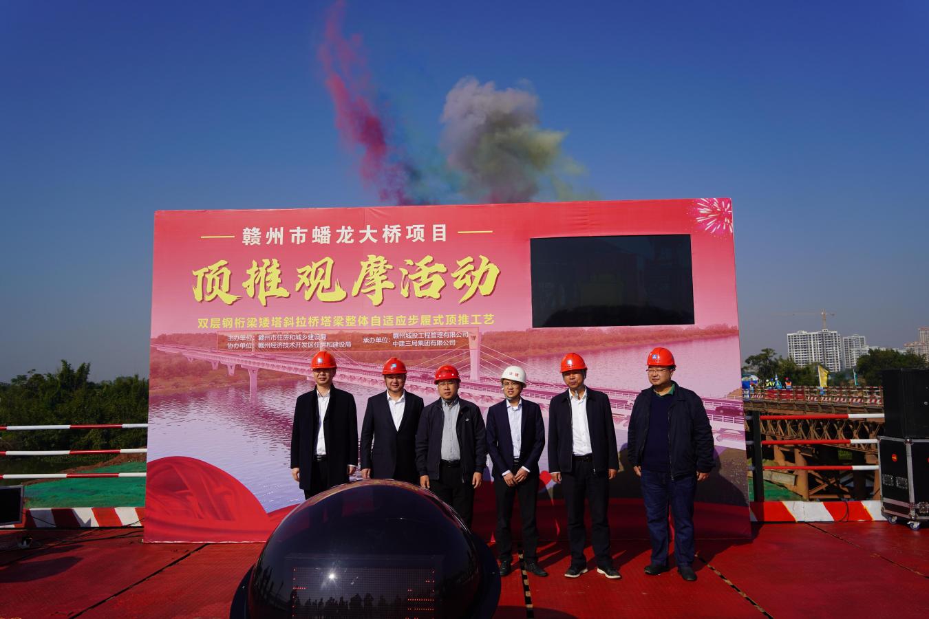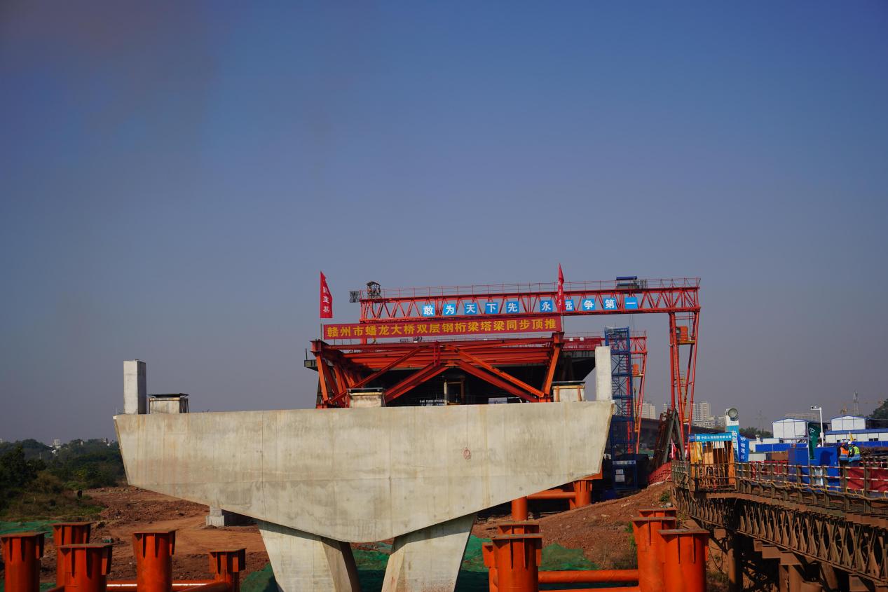12月6日,贛州市蟠龍大橋項(xiàng)目主橋鋼結(jié)構(gòu)首次頂推啟動(dòng),為主橋的順利推進(jìn)打下堅(jiān)實(shí)基礎(chǔ),標(biāo)志著該項(xiàng)目取得了全市重點(diǎn)項(xiàng)目建設(shè)百日攻堅(jiān)活動(dòng)任務(wù)目標(biāo)的節(jié)點(diǎn)性勝利。贛州經(jīng)濟(jì)技術(shù)開(kāi)發(fā)區(qū)住房和建設(shè)局,贛州城投工程管理公司、中建三局總承包公司等參建各單位代表共計(jì)60余人參加頂推啟動(dòng)活動(dòng)。