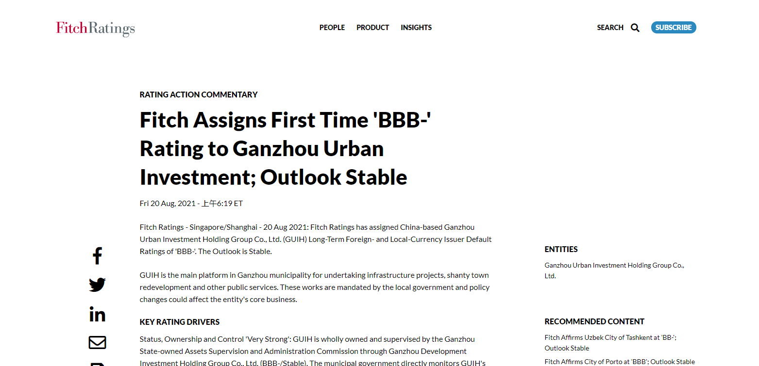 “穩(wěn)定”。由此,贛州城投集團國際信用開啟了投資級新篇章。此次投資級國際信用評級的獲得,再一次證明了贛州城投集團行業(yè)地位和雄厚實力,初步體現(xiàn)了境外資本市場對贛州城投集團影響力的高度認可,為贛州城投集團開展外資引進工作夯實了牢固基礎。