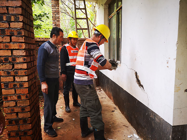 收到群眾訴求后,贛州建工集團黨支部明確責(zé)任分工,由贛州建工集團駐蓉江花園(四區(qū))項目部的工作人員前往實地了解情況。該村村民邱家飛年近七旬,所居住的房屋因年久失修,導(dǎo)致門廳墻面破損,房屋內(nèi)外均存在一定程度的裂縫。此外,村里另有一對姐弟居住的房屋由于結(jié)構(gòu)問題也存在幾處裂縫。